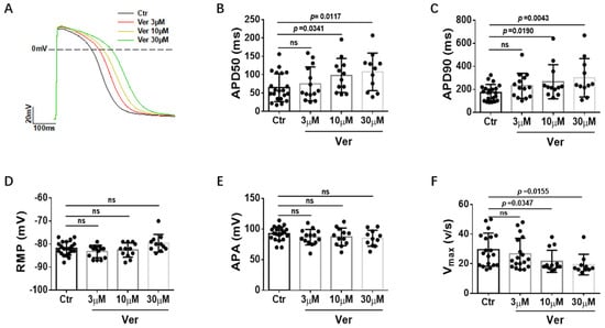 Vernakalant at different concentrations (3 µM, 10 µM and 30 µM) was applied to SQTS1-hiPSC-CMs to check its effects on APs triggered by stimulations at 1 Hz. The AP parameters, including action potential amplitude (APA), the maximal upstroke velocity (Vmax) and action potential durations at 50% and 90% repolarization (APD50 and APD90), were analyzed. Vernakalant at the concentration of 10 µM and 30 µM significantly prolonged APD. At 10 µM, APD50 was prolonged from 64.4 ± 8.4 ms to 97.6 ± 13.3 ms and APD90 from 172.7 ± 15.4 ms to 266.4 ± 42.6 ms, whereas at 30 µM, APD50 was prolonged to 107.4 ± 15.4 ms and APD90 to 301.2 ± 50.1 ms (Figure 1A–C). Vernakalant at all the tested concentrations failed to affect resting membrane potential (RMP) and APA (Figure 1D,E), but reduced Vmax in a concentration-dependent manner (Figure 1F), consistent with its Na channel-blocking effect. In hiPSC−CMs from the healthy donor, vernakalant showed similar effects on AP parameters (Figure S1).