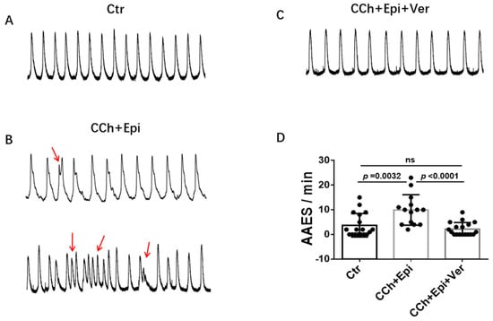 Vernakalant reduced arrhythmia-associated events. Calcium transients were measured in spontaneously beating cells. Then carbachol (10 µM) plus epinephrine (10 µM) was applied to cells to trigger arrhythmia-associated events (AAEs). In cells showing AAEs, vernakalant (Ver, 10 µM) was applied to the cell in presence of carbachol and epinephrine. (A) Representative traces of calcium transients in a cell before challenging (Ctr). (B) Representative traces of calcium transients in the cell challenged by carbachol plus epinephrine (CCh+Epi). (C) Representative traces of calcium transients in the cell in the presence of carbachol plus epinephrine and vernakalant (CCh+Epi+Ver). (D) Averaged values of AAEs per minute. CCh+Epi slowed the beating but led to small and irregularly triggered beating. The AAEs were defined as transients that are larger than 10% but smaller than 80% of the normal regular transients. Data are shown as mean ± SEM from 18 cells. p values were determined by One Way ANOVA analysis followed by Holm-Sidak method.