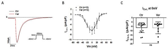 Vernakalant had no effect on L-type calcium channel currents. The L-type Ca channel currents (ICa-L) were evoked by the protocol indicated in A. (A) The representative traces of ICa-L. (B) Current-voltage relationship (I-V) curves of ICa-L in absence (Ctr) and presence of vernakalant (Ver, 10 µM). (C) Mean values of ICa-L at 0 mV in absence (Ctr) and presence of vernakalant (Ver, 10 µM). Data are shown as mean ± SEM from 15 cells. ns implies “not significant” determined by paired t-test.