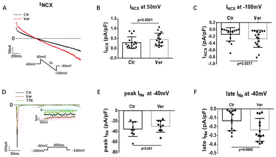 Vernakalant enhanced Na/Ca exchanger and late Na channel currents. The Na/Ca exchanger currents (INCX) were evoked by the protocol indicated in A. INCX was analyzed as NiCl2 (5 mM) -sensitive currents. Peak and late Na channel currents (late INa) were evoked by the protocol indicated in D and late INa was measured at 300 ms after initiation of the depolarization pulse. TTX (30 µM) -sensitive currents were analyzed as late INa. (A) Representative traces of INCX in absence (Ctr) and presence of vernakalant (Ver, 10 µM). (B,C) Mean values of INCX at 60 mV and−100 mV in absence (Ctr) and presence of vernakalant (Ver, 10 µM). (D) Representative traces of peak and late INa in absence (Ctr) and presence of vernakalant (Ver, 10 µM). (E) Mean values of peak INa at −40 mV in absence (Ctr) and presence of vernakalant (Ver, 10 µM). (F) Mean values of late INa at −40 mV in absence (Ctr) and presence of vernakalant (Ver, 10 µM). Data are shown as mean ± SEM. p values were determined by paired t-test.