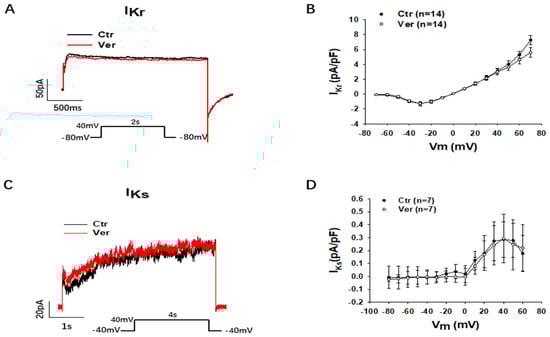 Vernakalant failed to affect IKr and IKs. The currents (IKr and IKs) were evoked by the protocol indicated in A and C. IKr was measured as Cs+ currents. IKs was analyzed as Chromalol-293B (10 µM)-sensitive currents. (A) Representative traces of IKr in absence (Ctr) and presence of vernakalant (Ver, 30 µM). (B) I-V curves of IKr in absence (Ctr) and presence of vernakalant (Ver, 30 µM). (C) Representative traces of IKs in absence (Ctr) and presence of vernakalant (Ver, 30 µM). (D) I-V curves of IKs in absence (Ctr) and presence of vernakalant (Ver, 30 µM). Data are shown as mean ± SEM.