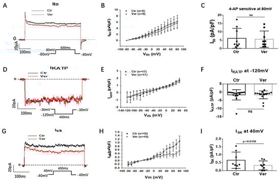 Vernakalant suppressed ISK but not Ito and IKATP. The currents (Ito, IKATP and ISK) were evoked by the protocol indicated in A, D and G. IKATP was measured as glibenclamide (10 µM) -sensitive currents. Ito was analyzed as 4-AP (5 mM) -sensitive currents. ISK was analyzed as apamin (100 nM) -sensitive currents. (A) Representative traces of Ito at +80 mV in absence (Ctr) and presence of 30 µM vernakalant (Ver) in hiPSC-CMs from SQTS patient. (B) I-V curves of Ito in absence (Ctr) and presence of vernakalant (Ver) in hiPSC-CMs from SQTS patient. (C) Mean values of Ito at +80 mV in absence (Ctr) and presence of vernakalant (Ver) in hiPSC-CMs from SQTS patient. (D) Representative traces of IKATP in absence (Ctr) and presence of vernakalant (Ver, 30 µM) at −120 mV. (E) I-V curves of IKATP in absence (Ctr) and presence of vernakalant (Ver, 30 µM). (F) Mean values of IKATP at −120 mV in absence (Ctr) and presence of vernakalant (Ver, 30 µM). (G) Representative traces of ISK at +40 mV in absence (Ctr) and presence of vernakalant (Ver, 10 µM). (H) I-V curves of ISK in absence (Ctr) and presence of vernakalant (Ver, 10 µM). (I) Mean values of ISK at +40 mV in absence (Ctr) and presence of vernakalant (Ver, 10 µM). Data are shown as mean ± SEM. p values were determined by paired t-test, ns, not significant.