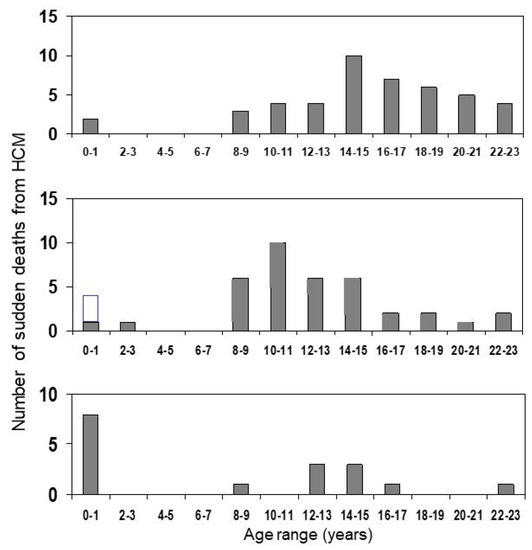 There is a widespread habit of researchers studying the incidence of sudden cardiac death (SCD) to try to quantify the risk in terms of per cent annual mortality. This may seem a convenient short-hand for comparing SCD-mortality in different studies, but is scientifically incorrect, as the rate of SCD in different age bands varies significantly, being very low between 1–7 years of age, and higher in the 8–16 year age range; the mortality in the 8–16 year age range is also significantly higher when compared with the 17–30 year age range [12,15]. The degree of age-dependence of the risk is illustrated in Figure 1, which shows the number of SCDs occurring at different ages in three different studies. Viewing these graphs, one also needs to remember that the prevalence of diagnosed HCM cases is higher in later teenage years as compared to young children, with the median age at diagnosis ranging between 6 and 13 years of age in most studies of childhood-HCM (see Table 1 below).