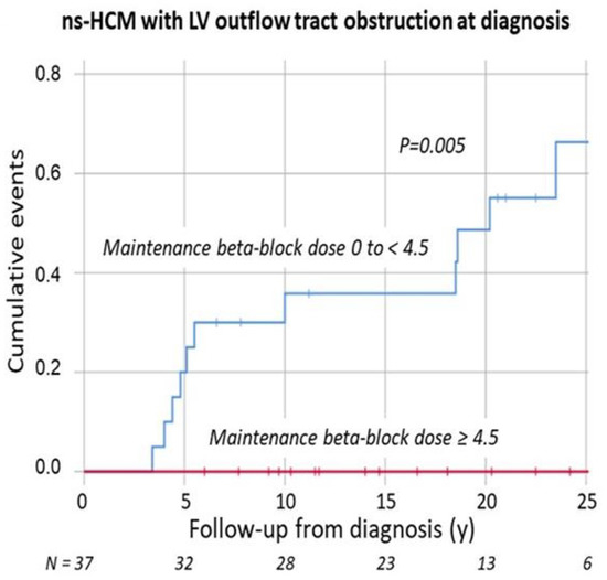 Kaplan–Meier analysis of accumulation of SCD-events in pediatric patients with non-syndrome-associated HCM and an outflow-gradient >20 mmHg at diagnosis, stratified depending on therapy after diagnosis, the curve in red illustrates patients with a propranolol-dose equivalent of ≥4.5 mg/kg/day (no events), and the blue curve patients with no beta-blocker therapy, or a dose equivalent to <4.5 mg/kg/day. Ticks on curve indicate patients being censored alive, and follow-up duration is measured in years. N indicates number of patients left in curve at different follow-up duration. (Reprinted with permission from Östman-Smith et al. Acta Paediatrica 2021, DOI: 10.1111/apa.16045 Supplementary Figure S1) [29], copyright authors, 2021.