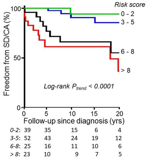 When the ECG risk score was >5 points as calculated above (with the high-risk cut-off validated by boot-strapping), it gave a sensitivity for the cardiac arrest of 84%, and high specificity in adult HCM-patients < 40 years of age [58]. In a national Swedish pediatric HCM cohort, with a 10.9 y mean follow-up, which also included patients who presented with SCD or resuscitated cardiac arrest (who are known to be at particularly high risk), the same ECG risk score cut-off of >5 points conferred a very high relative risk of 46.5 [6.6–331] for SCD during later-follow-up, with a sensitivity of 97% [19]. The specificity for ECG risk score at the first visit was 69%, and the score at the last visit before the event was 80%, for the prediction of SD/CA in pediatric HCM-patients [19]. In a later study, excluding patients presenting with SCD or aborted SCD from the analysis and with a mean follow-up of 13.3 y, 40% of the population was test-positive [29]. Only including SCD in the first five years of follow-up as an end-point, an ECG risk score > 5 gave a specificity of 73% at diagnosis [29]. The risk for SCD is progressive with increasing value of ECG risk score as illustrated in Figure 4, and there is continued accumulation of SCD occurring even after five years of follow-up.