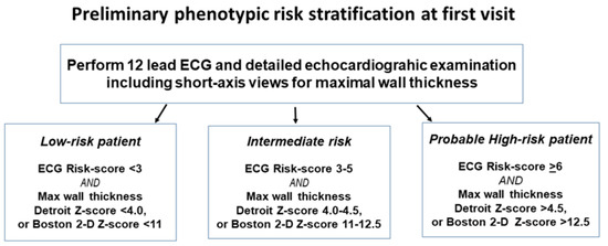 Recent studies have started to include ventricular tachycardia as part of a compound end-point, but neither those, nor appropriate ICD-discharges, are really equivalent to an SCD, so might mislead [89]. Instead, it would be more productive to include the clinical data from patients presenting with resuscitated cardiac arrest as the first disease manifestation, in order to increase end-points with really hard data. This should help identify the best risk factors by hazard ratio in order to attempt to construct new risk algorithms with higher specificity, perhaps only based on the phenotypic characteristics, and then treat non-sustained ventricular tachycardia on Holter and syncope as red flag events rather than as part of the algorithm. To include syncope in the algorithm, with a hazard ratio as high as 7.23 as in PRIMaCY (based on tertiary centre patients) certainly created a large amount of the false positives in our external validation. It seems a very high hazard ratio as compared with hazard ratios from other reported pediatric childhood-HCM studies of 0.7 (in a geographical cohort) [19], 2.1 [20], and 1.48 [28] respectively, as well as a meta-analysis in adult HCM which found a significant association in only four out of 10 studies, with three of those four positive ones having hazard ratios 1.5–2.5 only [90]. A proposed scheme for gradual patient assessment, based on initial categorization using only ECG- and LV maximal wall thickness findings to guide the urgency of further examinations, has been proposed but not formally evaluated in other patient cohorts [29]. The initial step in the proposed preliminary risk assessment, which could be used to assess the urgency of further investigations to more definitely assess risk status, is shown in Figure 5.