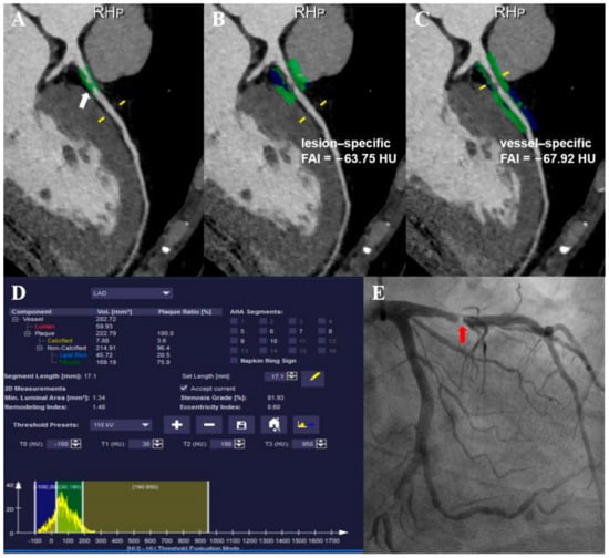 - Ma, S.; Chen, X.; Ma, Y.; Liu, H.; Zhang, J.; Xu, L.; Wang, Y.; Liu, T.; Wang, K.; Yang, J.; et al. Lesion-Specific Peri-Coronary Fat Attenuation Index Is Associated With Functional Myocardial Ischemia Defined by Abnormal Fractional Flow Reserve. Front. Cardiovasc. Med. 2021, 8, 755295. [Google Scholar] [CrossRef] [PubMed]