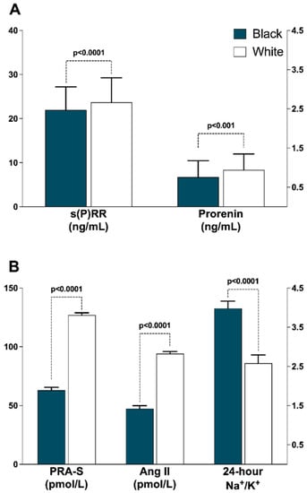 (Pro)renin receptor [(P)RR], with an affinity for both prorenin and active renin, is expressed in various organs, including cardiac myocytes, the kidney and brain [,,]. When activated, (P)RR elicits proinflammatory and profibrotic effects through the AngII-AT1R axis and intracellular signaling pathways such as mitogen-activated protein kinase (MAPK) and extracellular signal-regulated kinase 1/2 (ERK1/2) [,]. In earlier studies on the role of (P)RR as a biomarker, it was shown that binding of prorenin to (P)RR resulted in activation of MAPK p44/42 and tissue-growth factor-β (TGF-β), leading to increased contractility, hypertrophy and fibrosis [,]. Soluble (P)RR [s(P)RR], a product of (P)RR cleavage, is adversely linked to lipid and glucose metabolism and BP in mice []. In human studies, patients with heart failure presented with higher plasma s(P)RR levels as compared to healthy controls []. Observations on (P)RR and s(P)RR in relation to target organ damage have prompted suggestions that blockade of renin receptors may serve as a target for tissue protection []. However, evidence on the use of s(P)RR as a clinical marker is inconclusive, possibly due to limited data in population studies, especially on circulating s(P)RR. Nguyen et al. [] showed that s(P)RR differed by ethnicity, being lower in black (n = 9) as compared to white men (n = 10). For the s(P)RR comparison, the study included a small sample of black and white participants, highlighting the need for further studies in human populations to confirm the ethnic differences in s(P)RR. Ethnic differences are important when investigating RAS due to the known lower levels of classical RAS components in black populations as compared to their white counterparts, and the impact on response to some classes of antihypertensive drugs [,,].