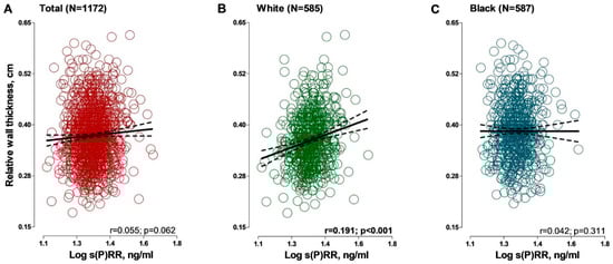 Associations between relative wall thickness and soluble (pro)renin receptor in (A) total group; (B) black group and (C) white group. Solid and dashed lines represent the regression line and 95% CI boundaries, respectively. Abbreviations: s(P)RR, soluble (pro)renin receptor.