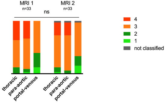 Changes in classification for thoracic and abdominal lymphatic congestion in MRI 1 and 2. Stacked bar graph illustrating distribution of lymphatic classification: light green type 1, dark green type 2, orange type 3, red type 4 and grey not classified. Thirty-three patients underwent two MRIs. There were no significant changes in lymphatic classification between MRI 1 and 2 (not significant = ns).