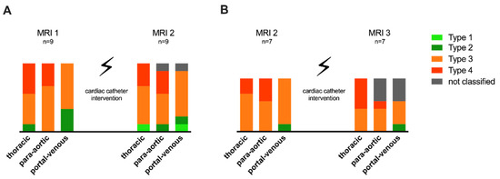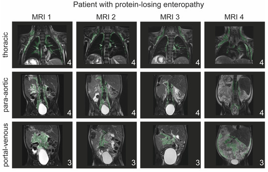 Between MRI 1 and 2, nine (27.3%) patients did not show any changes in their thoracic, para-aortic or portal-venous lymphatic abnormalities, while 24 (72.7%) patients showed changes in their classification. Despite changes in classification being observed in most patients, those were mostly mild and, therefore, did not meet statistical significance. Clinically, it has been shown that higher-grade (type 3 and 4) abnormalities show reduced outcome [5]. In total, four (12.1%) patients changed from low-grade (type 1 or 2) congestion to higher-grade, and four (12.1%) patients from higher-grade abnormalities to a lower classification.