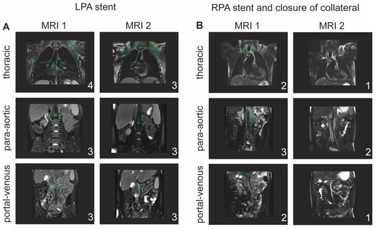 Example of lymphatic abnormalities after cardiac catheter intervention. (A) Patient who underwent first cardiac MRI at 13 years of age showing moderate left pulmonary artery (LPA) stenosis. The T2-weighted imaging showed significant thoracic lymphatic abnormalities (type 4) and para-aortic and portal-venous abnormalities type 3. The 2nd MRI was performed after cardiac catheterization and LPA stent implantation showing mildly improved thoracic lymphatic abnormalities. (B) 25-year-old Fontan patient in good clinical condition presented with significant stenosis of the right pulmonary artery (RPA) on 1st MRI. Cardiac catheter intervention with balloon dilatation of the RPA and closure of a major aortopulmonary collateral (MAPCA) from the descending aorta was performed. Repeat MRI at the age of 30 years showed improvement in lymphatic abnormalities in all three compartments. Lymphatic abnormalities are highlighted in green.