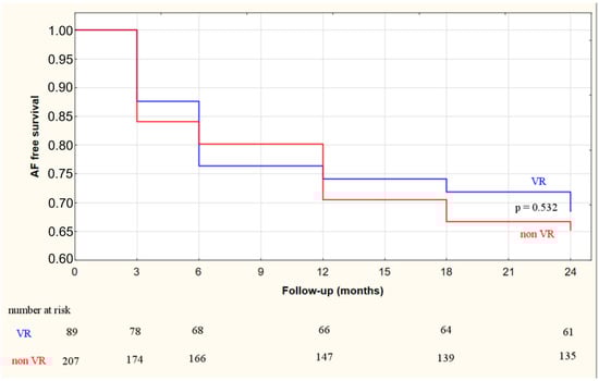 The overall AF free survival rate beyond a 3-month blanking period was 72% (213/296) at 12 months following ablation and decreased to 66% (196/296) at 24 months. No significant difference of ablation efficacy between the VR and non-VR group was noted: 74% (66/89) vs. 71% (147/207) at 12 months (p = 0.39) and 69% (61/89) vs. 65% (135/207) at 24 months (p = 0.53), respectively (Figure 2).