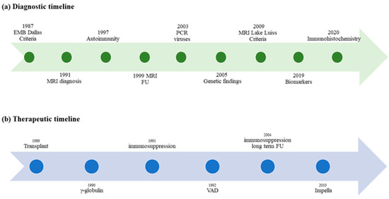 Timelines of milestones in diagnosis and therapy of myocarditis in children. (a) Milestones of diagnosis in pediatric myocarditis over time; (b) Evidence of therapy in children with myocarditis: the therapeutic approach is not supported by specific pediatric clinical trials.