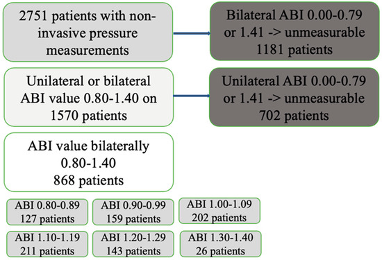 Although the present study is based on a relatively large original cohort of patients, unfortunately, the anticipated number of patients in the range category ABI 1.30–1.40 has insufficient statistical power. The non-invasive pressure values were measured in a high-volume standardized vascular laboratory. Values were collected retrospectively from an electronic database as PDF files of the original datasheets. Due to the retrospective nature of our study, all demographic data were based on the official diagnosis. The accuracy was fair, but diagnoses such as atrial fibrillation might vary if treated and would be more reliably evaluated in an observational, prospective follow-up study.