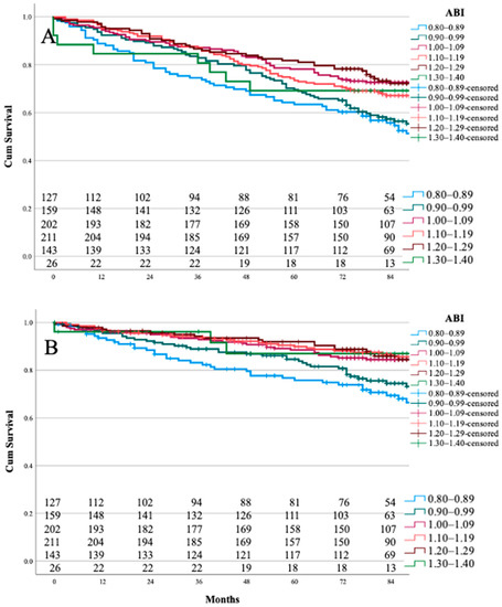 The estimated survivals and cardiovascular-death-free survivals and 1-, 3-, and 5-year survival rates for each ABI range category are presented in Table 3A,B.