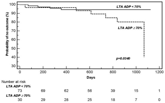 Kaplan–Meier curves of group considered “aspirin resistant” versus not “aspirin resistant” by light transmission aggregometry (LTA) using ADP.