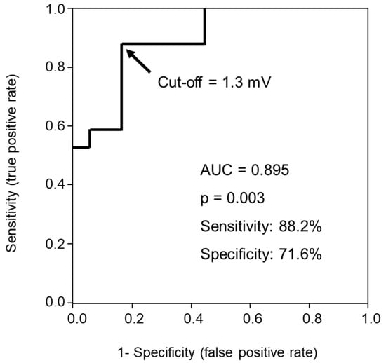 Receiver operating characteristic curve of averaged S-wave amplitude in right precordial leads for predicting mitral regurgitation reduction following cardiac resynchronization therapy.