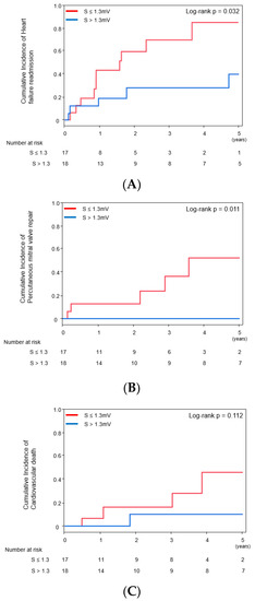 Cumulative incidence of clinical events stratified by the cutoff of S-wave amplitude ((A) heart failure readmission; (B) percutaneous mitral valve repair; (C) cardiovascular death). Odds ratio of S > 1.3 mV for heart failure readmission was 0.31 [0.10–0.95], p = 0.040, and for cardiovascular death was 0.11 [0.01–0.95], p = 0.045.