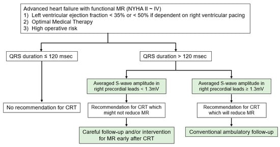 We propose a simple practical strategy (Figure 4). If patients have LVEF <35% (or <50% if dependent on right ventricular pacing), QRS duration is the first checkpoint. In the presence of wide QRS duration, current guidelines suggest CRT implantation irrespective of MR (conventional recommendation) [4,5,6]. Furthermore, we propose an additional ECG marker, S-wave amplitude in right precordial leads, that further discriminates optimal patients who can enjoy the MR reduction as well as favorable clinical outcomes following CRT implantation (novel recommendation).