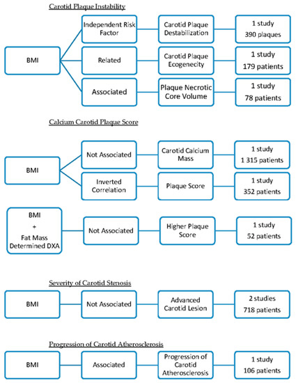 - A histological study analyzed the relationship between obesity and the severity of atherosclerosis carotid plaque [19]. The atherosclerotic lesions were described according to the American Heart Association classification [19]. BMI did not independently predict the risk of developing advanced carotid atherosclerotic lesions (including 185 cadavers of men and women) [19].