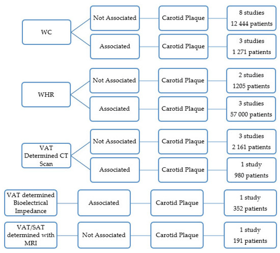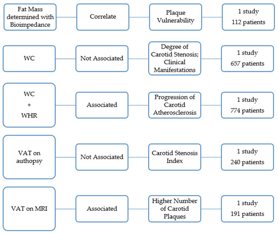 One paper concluded that VAT measured with bioelectrical impedance was associated with a higher prevalence of atherosclerotic carotid plaques [37]. This study was limited to 352 patients with rheumatoid arthritis (Figure 4) [37].