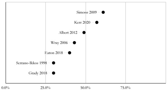 Studies used a variety of subjective (e.g., self-report) and objective (e.g., drug levels) measures. The reported rates of adherence varied greatly. In five studies, the nonadherence rate ranged from 40 to 60% [6,13,17,21,23]. Grady et al. (2018) found that approximately 70% of participants had CNI levels within the target range [16], and Serrano-Ikkos et al. (1998) found 69.8% of patients had good adherence, based on CNI levels and self-reported data [22]. In two studies, approximately 20% of patients reported at least one late or missing dose of immunosuppression medication in the last week [13,18], and 28% of caregivers reported that their adolescent/young adult (AYA) took one or more doses of antirejection medications late in the past week [13]. Figure 2 is a graphical representation of reported nonadherence rates, as described above. Table 2 outlines the different adherence measures used.