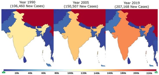 This map of India (modified from Global Burden of Disease; GBD) shows the increase in the incidence of DCM in India in years between 1990 to 2019. There were 106,460 new cases in 1990. Incidents massively increased and 150,507 new cases were reported in 2005. Spike in incidence increased further and 207,168 new cases were reported in 2019. This data clearly indicates that the incidence of DCM is increasing at an alarming rate in India [Adapted with permission from IHME, Seattle, DC, USA “Source: Institute for Health Metrics Evaluation. Used with permission. All rights reserved” [15]. Accessed on 18 April 2021.