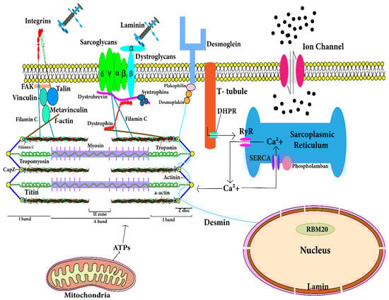 Dystrophin is a massive cytoskeletal protein, which is coded by the DMD gene. It is present in high amounts in skeletal, smooth and cardiac muscle cells and also in low amounts in brain cells [60]. Dystrophin is a large 2.4 mb gene. The 3685 amino acids are encoded by 79 exons of the DMD gene. The DMD gene has different promoters expressed in different tissues. Alternative splicing of the DMD gene give rise to different isoforms of dystrophin protein. Dystrophin is a rod-shaped protein and is around 150 mm long in length. Dystrophin is believed to contribute to maintaining membrane stability, force transmission and intracellular organization. Mutation in the DMD gene is found to contribute to X-linked DCM-associated death within just 1–2 years after diagnosis [61]. Deletion, missense, insertion, inversion and point mutations in the DMD gene result in abnormalities of the dystrophin protein [62].