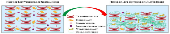 DCM progression is initiated by various genetic and idiopathic factors. Classically, “Frank-Starling law” described the causal relationship between resultant contraction force with cardiac fiber length [70]. Mutations in sarcomeric, non-sarcomeric and cytoskeletal protein components have been attributed mechanically to cardiac contraction reduction during DCM [33]. During the pathological progression of DCM, cardiomyocytes gradually undergo various changes leading to compromised function and morphology leading to reduced systolic performance with dilated ventricles [71]. In DCM, significant death of cardiomyocytes occurs by the process of apoptosis (Figure 3) [72]. Accumulation of collagens and other extracellular matrices (ECM) proteins in the ECM followed by the cardiomyocyte apoptosis leads to myocardial fibrosis [73]. The proliferation of cardiac fibroblasts to myofibroblasts in response to profibrotic stimuli contributes majorly to the fibrosis [74]. These processes lead to the dilation and stiffening of the left ventricle, a definitive hallmark of DCM [75] (Figure 3). The myocardium becomes thinner and the ventricle is stretched, leading to dysfunction in heart [76].