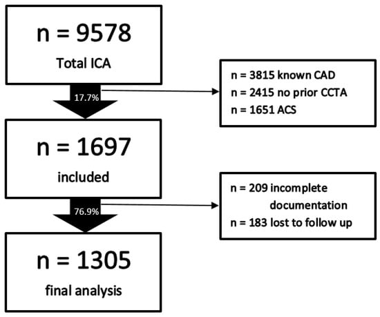 A total of 9578 patients were retrospectively screened over 4 years; 7881 were excluded due to known CAD, lack of previous CCTA, and ACS. Of the remaining 1697 patients, 392 were excluded due to incomplete documentation and lack of follow-up. Thus, data from 1305 patients referred to ICA after pathologic CCTA were included in our final analysis. We defined a pathologic CCTA as a stenosis of >50% in one or more epicardial vessels. The indication of CCTA was made by board-certified cardiologists or specialists in internal medicine from primary, secondary, or tertiary referral centers. The study was approved by our local institutional review board; patients’ informed consent forms were waived. A flowchart illustrating patient selection is shown in Figure 1.