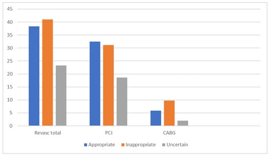 Interestingly, coronary revascularization rates did not differ significantly between the appropriate and the inappropriate groups (38.3% vs. 41%, p = 0.068). The rates of percutaneous coronary interventions were similar; the rate of CABG was higher in the inappropriate group.