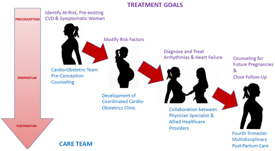 As shown in the Figure 1, a multidisciplinary care team starts during the pre-conception phase and is required throughout the pregnancy and postpartum phase, especially in women with HF and arrhythmias. Coordinated cardio-obstetrics clinics have decreased adverse cardiac complications during and after pregnancy [5]. The members of the cardio-obstetrics team (also referred to as the pregnancy heart team) may vary depending on the patient’s specific needs. However, typically teams include the following when HF or significant arrhythmias are present: cardio-obstetrics, cardiovascular medicine, maternal–fetal medicine, obstetrics, primary care, genetics, nursing, pharmacy, social work, and other specialists including anesthesiologists, HF cardiologists, electrophysiologists, and allied professionals [83,84]. A neonatologist is a vital team addition to discuss fetal/neonatal risks when preterm delivery may be indicated see (Figure 1).