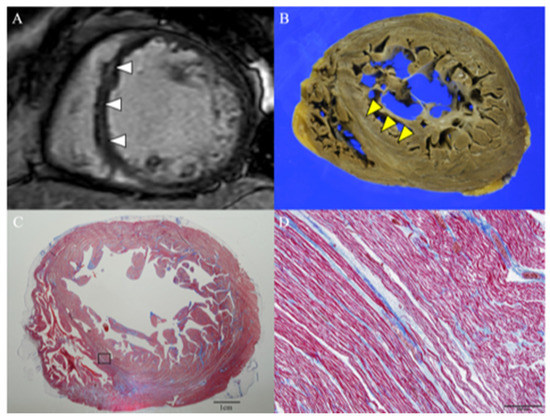 Cardiac Magnetic Resonance Imaging and Histopathological Findings. Cardiac magnetic resonance (CMR) short-axis image of the mid-ventricle revealed a linear late gadolinium enhancement (LGE) of the septal wall (arrow) (A). Macroscopic autopsy image corresponding to the CMR image showed fibrosis in the mid-ventricle septal wall (arrow) (B). Loup image showed diffuse fibrosis (blue) in the Masson’s trichrome stained ventricular myocardium sample (C). Magnitude image (×100) from a region of LGE in the above CMR image demonstrated a thinning and wavy change in cardiomyocytes and massive interstitial fibrosis and edema (D).