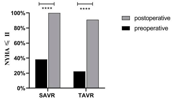 The primary and secondary endpoint results at 30-day follow-up for the TAVR and SAVR groups before and after matching are described detailed in Table 2. Neither group had a significant difference in mortality before or after matching. In the secondary endpoints, the differences were mainly in the speed of recovery, paravalvular leak incidence, and rate of bleeding. This was reflected in the data as the mean total hospital stay, and ICU stay in the TAVR group was significantly shorter than in the SAVR group (before matching: TAVR 11.41 ± 10.43 days vs. SAVR 11.29 ± 3.73 days, p < 0.05; TAVR 1.86 ± 5.78 day vs. SAVR 5.05 ± 2.02 days, p < 0.05; after matching: TAVR 12.37 ± 13.79 days vs. SAVR 12.63 ± 4.44 days, p < 0.05; TAVR 3.50 ± 10.83 day vs. SAVR 5.88 ± 2.60 days, p < 0.05). There was better performance in the TAVR group than in the SAVR group in terms of the major bleeding (before matching: TAVR 7.4% vs. SAVR 26.2%, p < 0.05; after matching: TAVR 6.3% vs. SAVR 37.5%, p < 0.05). However, for paravalvular leaks, two patients with paravalvular leaks were detected at 30-day follow-up in the SAVR group; both cases were mild. Twenty-three patients with paravalvular leaks were seen in the TAVR group, 19 with mild and 4 with moderate. No patients had severe paravalvular leaks, and there was a statistical difference between the two groups (before matching: TAVR 33.8% vs. SAVR 4.8%, p < 0.05; after matching. (TAVR 37.5% vs. SAVR 0). In relation to the incidence of the 3rd degree AV block and the rate of permanent pacemaker (PPM) implantation, there were six patients with 3rd degree AV block in the TAVR group before matching, and five of them had PPM implantation. No patients in the SAVR group were found to have 3rd degree AV block, nor did any patients have PPM implantation for other reasons. Finally, for an objective evaluation of the efficacy of the procedures in both groups, Figure 1 shows the change in NYHA classification of patients both groups before and after surgery, which shows that the percentage of patients with NYHA grade III or higher decreased significantly in both groups postoperatively.