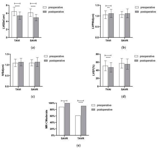 Cardiac ultrasound data changes in both groups before surgery and at 30-day follow-up: (a) LVEDd, left ventricular end-diastolic diameter; (b) LVPWd. left ventricle posterior wall daimeter; (c) IVSd, interventricular Septal diameter; (d) LVEF, left ventricular ejection fraction; (e) MR, mitral valve regurgitation. * means p ≤ 0.05, ** means p ≤ 0.001, and **** means p ≤ 0.0001.