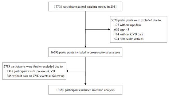 For cross-sectional analysis, survey data from CHARLS 2011 were used. Participants were excluded for the following criteria: (1) individuals aged <45 years old; (2) <30 deficits; (3) no CVD events data. For the cohort analysis, data from CHARLS 2011, 2013, 2015 and 2018 were used, and participants with prior CVD at baseline or without data on CVD events at follow-up were further excluded. Finally, A total of 16,293 and 13,580 participants aged over 45 years old were included in the cross-sectional and longitudinal analyses, respectively. The selection process of individuals included in the study is shown in Figure 1.