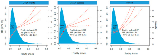 In the restricted cubic spline model, CVD events increased relatively stably until the frailty index reached 0.08 and then increased rapidly (p <0.0001 for nonlinearity). When the frailty index was above 0.08, the HR per standard deviation was 1.18 (95% CI 1.13–1.25) (Figure 2).