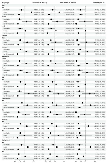 Interestingly, we also found that the strength of frailty index to predict CVD events decreased with age. This suggests that frailty assessment in midlife may help prevent late CVD development. Similarly, several prospective studies showed that the strength of the frailty index to predict mortality events decreased with age [3,31,32]. Different from previous studies [31,32], we found that compared with women, men had a higher prevalence of frailty and a stronger association between the frailty index and CVD. Furthermore, few studies have investigated differences in associations between the frailty index and CVD in residence and BMI level. Our study raises the possibility that the strength of the association was stronger in rural areas and individuals with BMI ≥ 25, though further investigations should be undertaken to explore the detailed relationship and their underlying mechanisms.