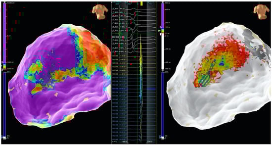 - Vergara, P.; Trevisi, N.; Ricco, A.; Petracca, F.; Baratto, F.; Cireddu, M.; Bisceglia, C.; Maccabelli, G.; Della Bella, P. Late potentials abolition as an additional technique for reduction of arrhythmia recurrence in scar related ventricular tachycardia ablation. J. Cardiovasc. Electrophysiol. 2012, 23, 621–627. [Google Scholar] [CrossRef] [PubMed]