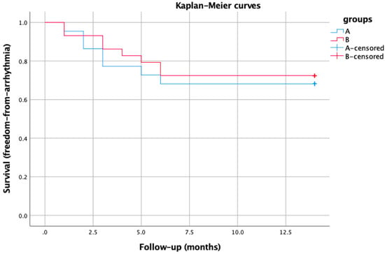 Kaplan–Meier survival curves showing no significant difference in the overall arrhythmia-free survival between the two groups.