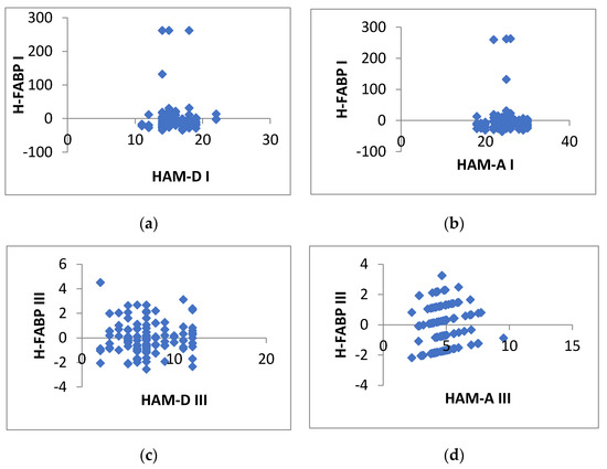 Insignificant negative associations between H-FABP levels and psycho-emotional scores: (a) H-FABP and HAM-D in phase I; (b) H-FABP and HAM-A in phase I; (c) H-FABP and HAM-D in phase III; (d) H-FABP and HAM-A in phase III (N = 120).