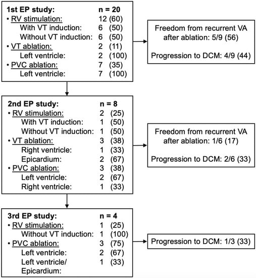 - Dello Russo, A.; Casella, M.; Pieroni, M.; Pelargonio, G.; Bartoletti, S.; Santangeli, P.; Zucchetti, M.; Innocenti, E.; Di Biase, L.; Carbucicchio, C.; et al. Drug-refractory ventricular tachycardias after myocarditis: Endocardial and epicardial radiofrequency catheter ablation. Circ. Arrhythm. Electrophysiol. 2012, 5, 492–498. [Google Scholar] [CrossRef] [PubMed] [Green Version]