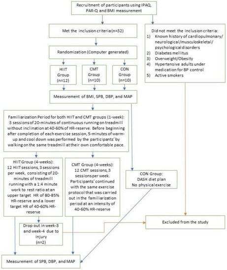 High-intensity interval training (HIIT) has been documented as a safe and effective training method for cardiac rehabilitation []. HIIT can be defined as a short burst of maximal effort interspersed by a few minutes of rest or active recovery, and it has been reported to be more effective than CMT for improving cardiorespiratory fitness in different populations [,,,,,]. HIIT, which consists of several bouts of high-intensity exercise (85–95% of HRmax) lasting 1 to 4 min interspersed with intervals of rest or active recovery [,,], has been found to improve endothelial function and its markers [,], insulin sensitivity [], markers of sympathetic activity [,], arterial stiffness [,], blood glucose and lipoproteins []. Despite these favorable outcomes, the efficacy of HIIT in reducing BP among pre-hypertensive young adults is not well established []. In addition, there is a scarcity of current literature comparing HIIT and CMT on BP in this particular population. Therefore, the primary purpose of this study was to determine the effects of HIIT and CMT on the BP of physically inactive pre-hypertensive young adults, and then to explore which type of exercise training is more efficient in lowering the BP of this population. To the best of the authors’ knowledge, this is the very first study to target pre-hypertensive young adults in Malaysia.