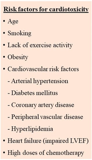 The early identification and management of the risk factors for cardiovascular side effects seems to contribute to the prevention or minimization of cardiotoxicity. Numerous risk factors, both patient-related as well as therapy-related, have been described (Figure 1) [2,3,4,5]. However, there are still differences in the definition of the high-risk patient as well as the type and the timing of the recommended investigations.