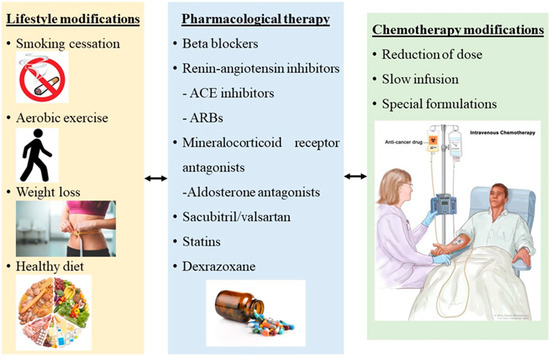During the last two decades, the established and most approved strategic management of prevention and treatment of chemotherapy-induced cardiotoxicity in HF with LV dysfunction and LVEF < 40% is the use of b-blockers, renin–angiotensin inhibitors including angiotensin-converting enzyme (ACE) inhibitors and angiotensin receptor blockers (ARBs), statins, the use of dexrazoxane and a non-pharmaceutical approach, physical exercise (Figure 3) [19].