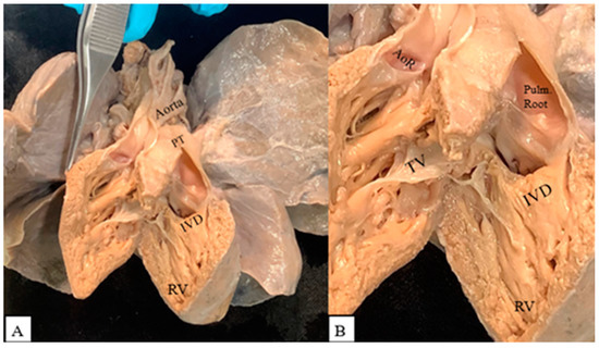 (A) Double outlet right ventricle with subpulmonary interventricular defect (IVD). PT: pulmonary trunk; RV: right ventricle. (B) Both arterial roots arising from the right ventricle. AoR: aortic root; Pulm. Root: pulmonary root; TV: tricuspid valve.