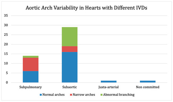 In total, 14 (31.1%) hearts had a subpulmonary IVD (95% CI prop: 17.6–44.6%), 29 (64.4%) had a subaortic IVD (95% CI prop: 50.4–78.4%), 1 (2.2%) had a juxta-arterial IVD (95% CI prop: 0–6.5%), and 1 (2.2%) had a non-committed IVD (95% CI prop: 0–6.5%). Out of the 10 hearts with aortic arch narrowing, 7 (70%) had a subpulmonary IVD (95% CI prop: 41.6–98.4%), and 3 (30%) had a subaortic IVD (95% CI prop: 1.6–58.4%). Out of the 11 arches with branching abnormalities, 1 (9.1%) had a subpulmonary IVD (95% CI prop: 0–26.1%), and 10 (90.9%) had a subaortic IVD (95% CI prop: 73.9–100%). Figure 5 shows the aortic arch variability among hearts with different interventricular communications.
