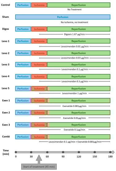 Heart preparation. The Langendorff-perfused isolated heart method offers a very reliable model for the analysis of contractile function and responses to ischemic insult [21,22,23,24]. All rats were anesthetized with pentobarbital sodium (50 mg/kg ip), Ketamine (75 mg/kg ip) and Xylazine (10 mg/kg ip). The inferior caval vein was exposed through median laparotomy and the rats were systematically treated with heparin sodium (1000 IU/kg) to avoid clot formation. After median sternotomy, hearts were fast excised from the rat chest and put into ice-cold Krebs-Henseleit (KH) solution to stop contractions. Hearts were then hung to the isolated perfusion apparatus and were retrogradely perfused via a cannula in the ascending aorta in a nonworking “Langendorff” preparation model at a constant pressure of 75 mmHg. The perfusion fluid had a stable pH of 7.4. KH solution and was used as a perfusate, containing 120 mM NaCl, 25 mM NaHCO3, 5.9 mM KCl, 1.2 mM MgSO4, 2.25 mM CaCl2, 1.2 mM KH2PO4 and 11 mM glucose. The perfusate was bubbled with Carbozen gas mixture (95% O2 and 5% CO2). The temperature of the perfusate solution and the heart chamber was maintained stable at 38 °C with a thermostatically controlled water-circulating system. [21,22,23,24]. A water-filled balloon fixed to a pressure transducer was inserted through the left atrium and the mitral valve into the left ventricle (LV) for determination of LV systolic pressure (LVSP) and end-diastolic pressure (LVEDP). LVEDP was adjusted to 5 mmHg before the start of the experiment by adjustment of the volume in the intraventricular balloon. In contrast to other methods of recording the hemodynamic response, such as the use of a force transducer attached to the apex or an intraventricular catheter, the isovolumetric condition obtained by the intraventricular balloon standardizes the situation with respect to preload and afterload [25]. The heart was initially perfused and stabilized for 30 min. After that, a regional ischemia of the anterior wall was induced through a ligation of the left anterior descending coronary artery (LAD). The LAD was encircled with a 6–0 Polypropylene suture near its origin, extending from the pulmonary cone to the myocardium under the left atrial appendage. The application of the suture following these specific anatomical landmarks ensures comparable myocardial ischemic area in all hearts. The suture was then passed through a tourniquet. Tightening and release of the tourniquet induced ischemia and reperfusion respectively. After an ischemia of 30 min, the coronary artery was opened and the heart was reperfused for 120 min. The hearts were randomly assigned to a control group (n = 9) where no treatment was applied, a sham group (n = 9) where no ischemia was applied, an negative control group (Digox, n = 9) with administration of Digoxin (Anfarm Hellas S.A., Kifisia 14564, Greece) with a perfusion rate of 1.67 μg/min and one of the nine experimental groups (n = 9 per group): administration of Levosimendan (Orion Pharma Hellas Sole Shareholder Co. Ltd., Alimos 17455, Greece) with a perfusion rate of 0.01 μg/min (Levo 1), Levosimendan with a perfusion rate of 0.03 μg/min (Levo 2), Levosimendan with a perfusion rate of 0.1 μg/min (Levo 3), Levosimendan with a perfusion rate of 0.3 μg/min (Levo 4), Levosimendan with a perfusion rate of 1 μg/min (Levo 5), Exenatide (AstraZeneca S.A., Athens 15123, Greece) with a perfusion rate of 0.001 μg/min (Exen 1), Exenatide with a perfusion rate of 0.01 μg/min (Exen 2), Exenatide with a perfusion rate of 0.1 μg/min (Exen 3) and coadministration of Levosimendan and Exenatide with a perfusion rate of 0.1 µg/mL and 0.001 μg/min, respectively (Combi). The administration of all additional pharmacologic agents started at 15 min of ischemia (in the middle of the ischemia phase) and was continued until the end of the experiment. The administration of the treatment lasted 135 min until the end of the reperfusion phase. The groups and the experimental protocol are presented in Figure 1.