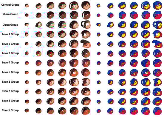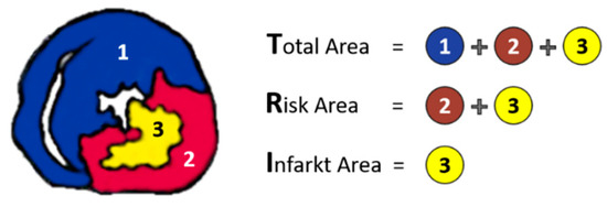 Estimation of the size of myocardial infarction. Infarct size was expressed as a percentage of ischemic myocardial area to the area at risk. In order to obtain a precise measurement of the infarct area and the area at risk, we used a common coloring method [34,35,36,37,38]. A total of 5 mL of 1% 2, 3, 5-triphenyltetrazolium chloride (TTC) phosphate buffer (37 °C, pH = 7.4) was administered to the hearts via the aortic cannula. Then, the heart was incubated in the 1% TTC solution for 10 min. After that, the LAD was closed by the tourniquet. Then, 3 mL of 2.5% Evans Blue solution, diluted in distilled water, was infused through the aortic cannula. Finally, the heart was washed and frozen at −20 °C for 24 h. Then, the hearts were transversely sliced in 2 mm sections from the apex to the base, slightly above the site of ligature of the LAD and parallel to the atrioventricular groove. Six sections were made in every heart. Then, the slices were incubated in 5% formaldehyde solution for 5 h. After placement between glass plates, stereoscopic images of the sections were taken and the risk zone, the infarcted area and the normal myocardium were identified. Sections of the ventricle have uniformly blue areas. After administration and incubation in TTC, viable myocardium stains brick red and the infarct appears pale white. The total area of the heart section (T), the area at risk (R) and the area of infarction (I) were determined by computerised planimetry using an image analysis software program (Image J V 1.8.0, National Institutes of Health and the Laboratory for Optical and Computational Instrumentation LOCI, University of Wisconsin, Madison, WI, USA) as shown in Figure 2.